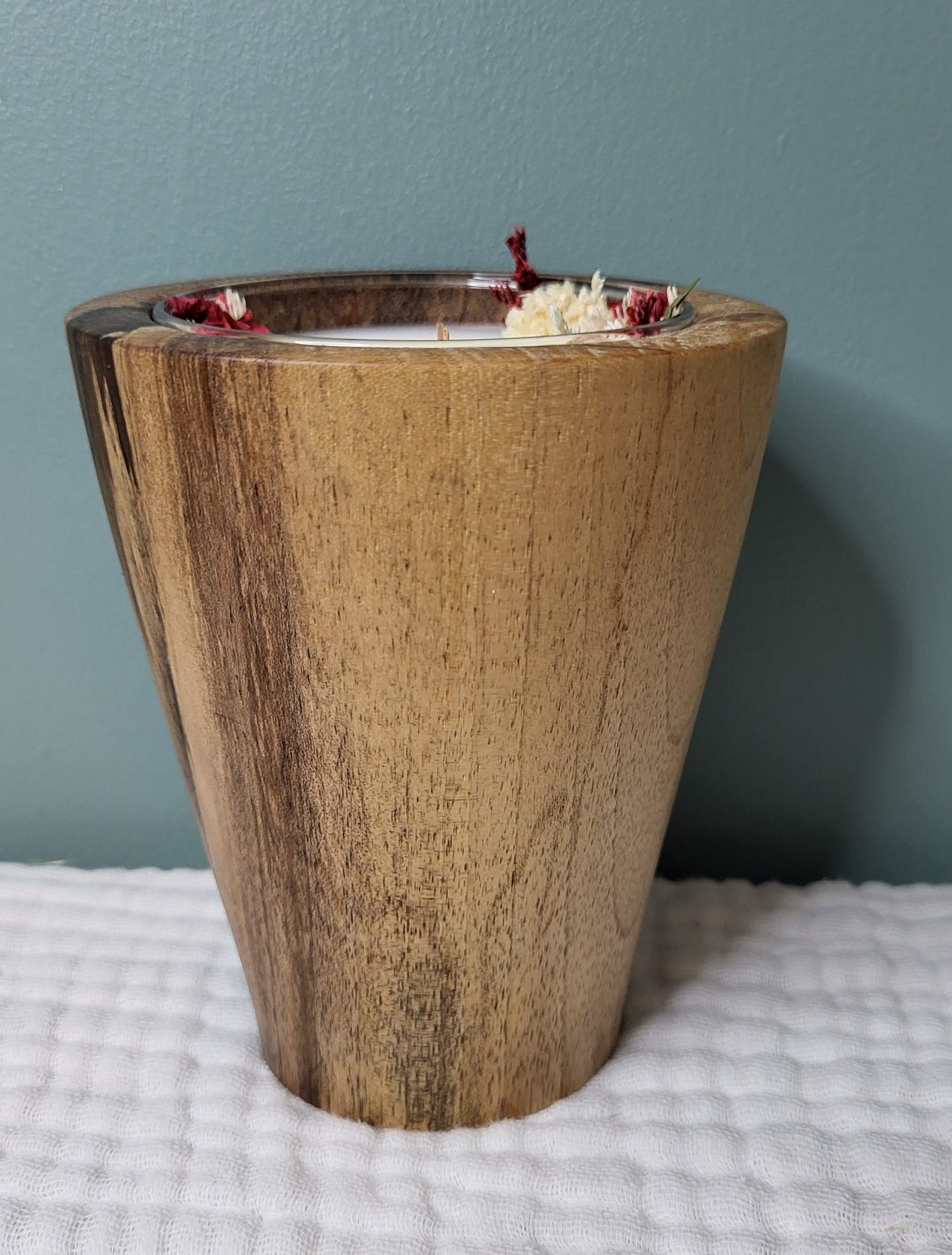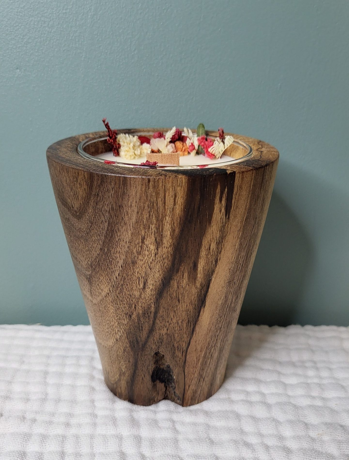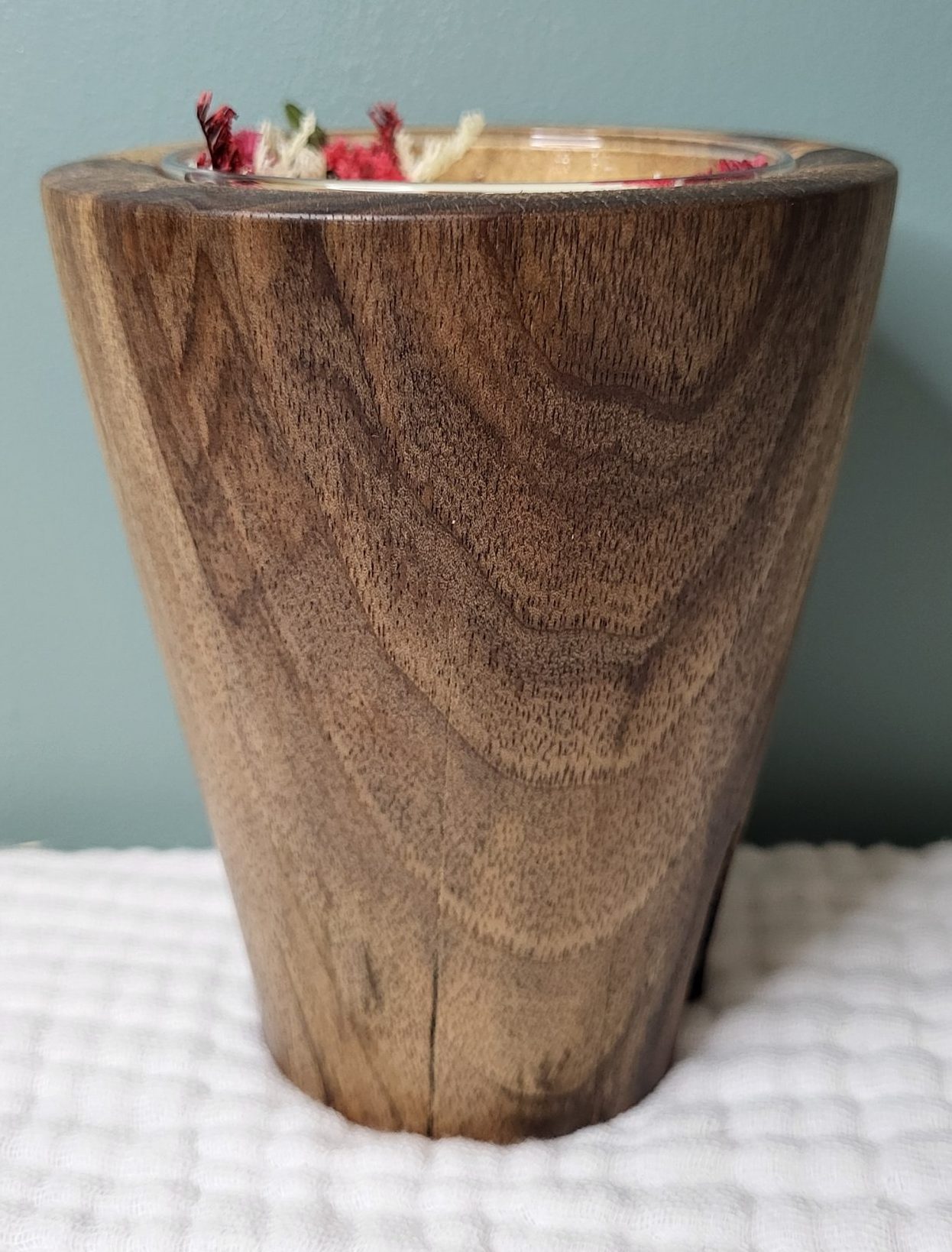 Le contenant en Noyer, travaillé au tour à bois dans notre atelier, met en valeur les veines naturelles du bois et fait de chaque bougie un objet singulier.