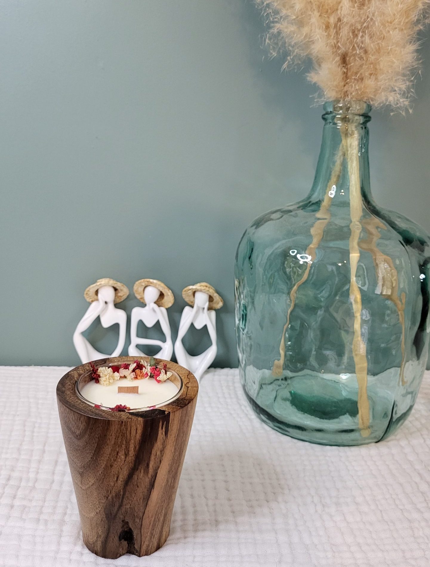 La mèche en bois diffuse une flamme douce et légèrement crépitante, tout en apportant une subtile coloration naturelle à la cire. Des fleurs séchées viennent délicatement agrémenter la bougie pour une touche végétale et poétique.