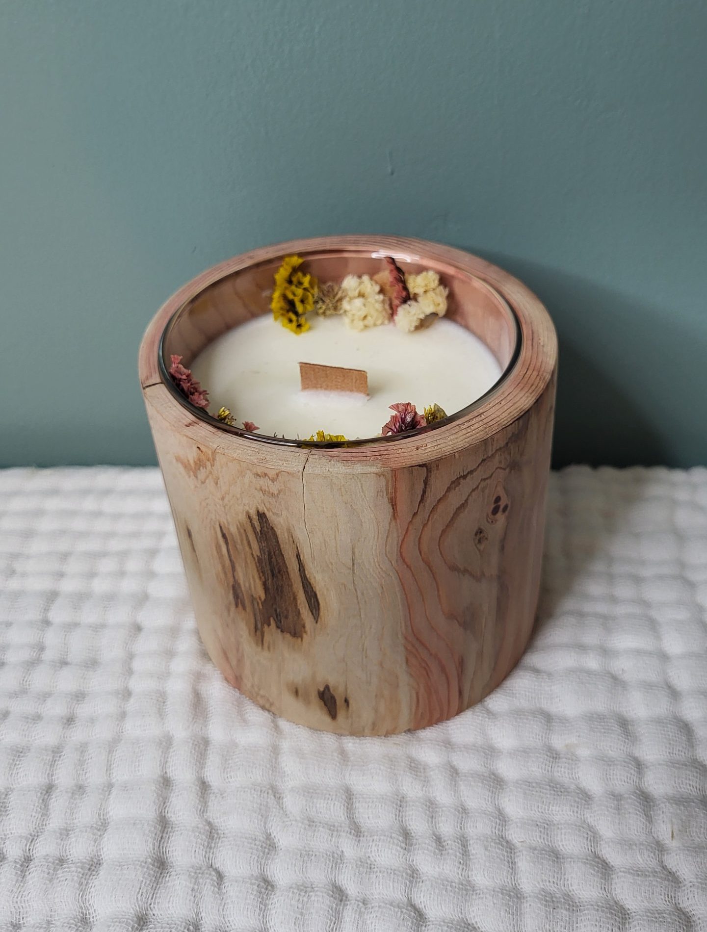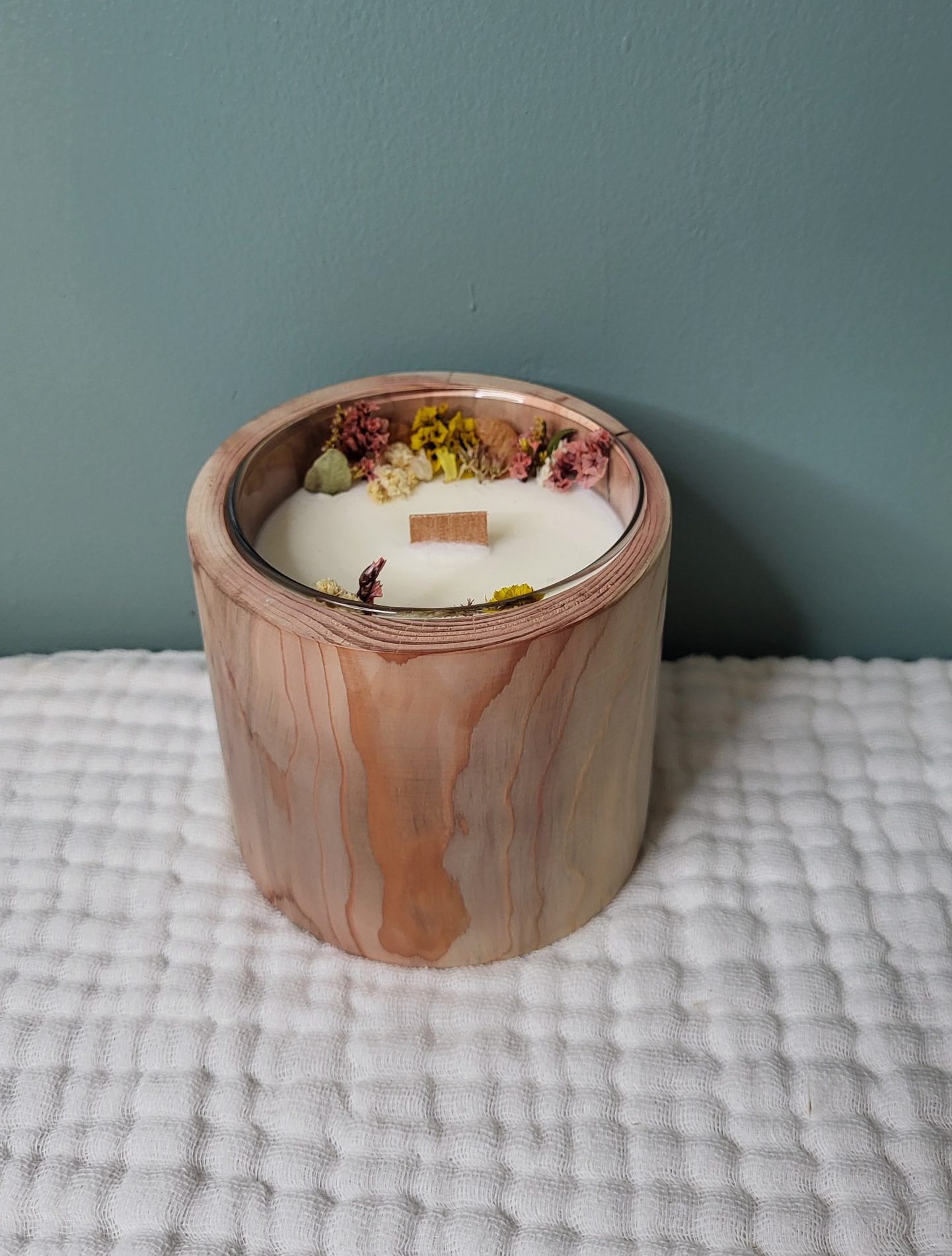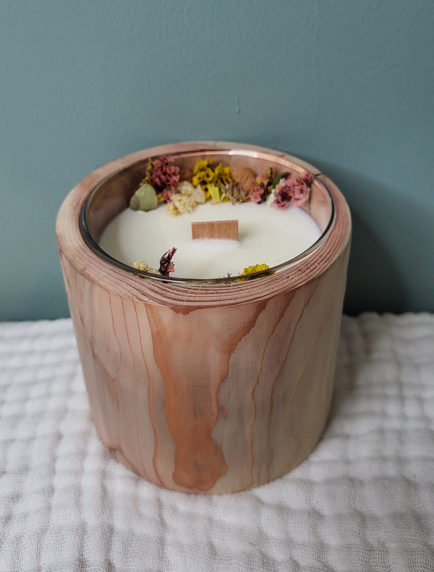 La mèche en bois diffuse une flamme douce et légèrement crépitante, tout en apportant une subtile coloration naturelle à la cire. Des fleurs séchées viennent délicatement agrémenter la bougie pour une touche végétale et poétique.