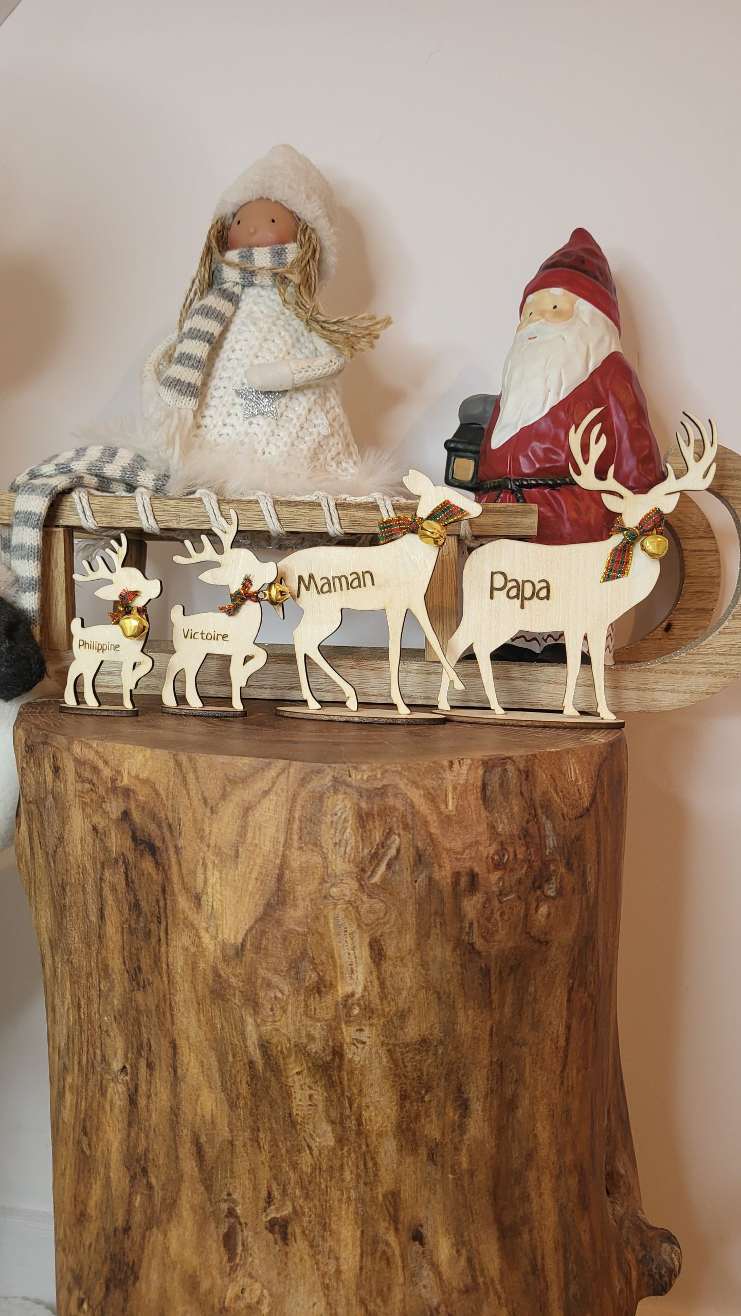 Je grave ensuite les prénoms que vous m’indiquez, pour créer une famille de rennes à votre image, un clin d’œil tendre et magique aux fêtes de Noël.